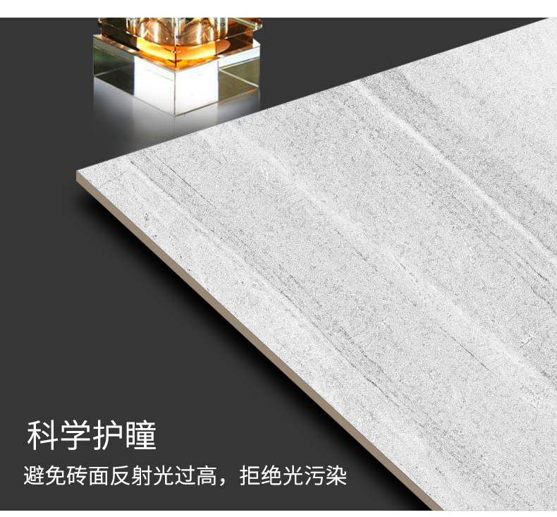 柔光瓷磚是磚面反射介于強光與弱光之間的一類瓷磚,其結合亮光類瓷磚的高調明艷裝飾和啞光類瓷磚的低調內斂搭配效果,通過動態柔光蠟拋技術,降低產品反光率,從而達到人體舒適的視覺感受以及無光污染的空間裝飾效果。優點:1.視覺舒適,無光污染 2.堅固耐磨,不易刮花.