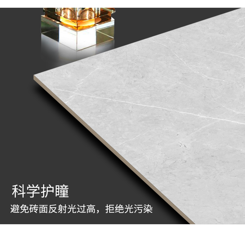 柔光瓷磚是磚面反射介于強光與弱光之間的一類瓷磚,其結合亮光類瓷磚的高調明艷裝飾和啞光類瓷磚的低調內斂搭配效果,通過動態柔光蠟拋技術,降低產品反光率,從而達到人體舒適的視覺感受以及無光污染的空間裝飾效果。優點:1.視覺舒適,無光污染 2.堅固耐磨,不易刮花.