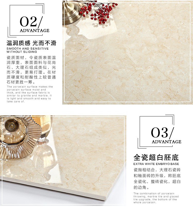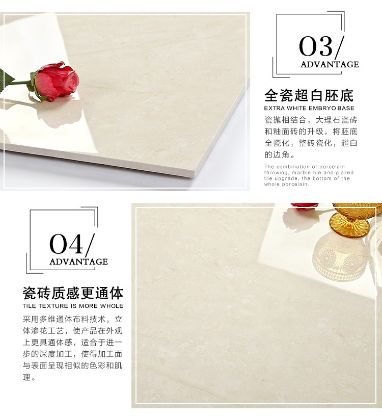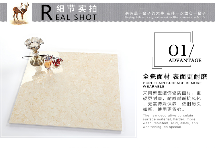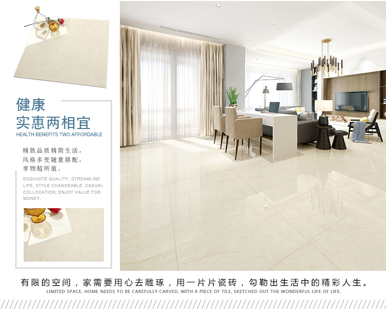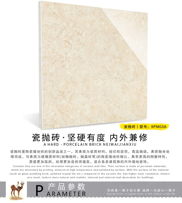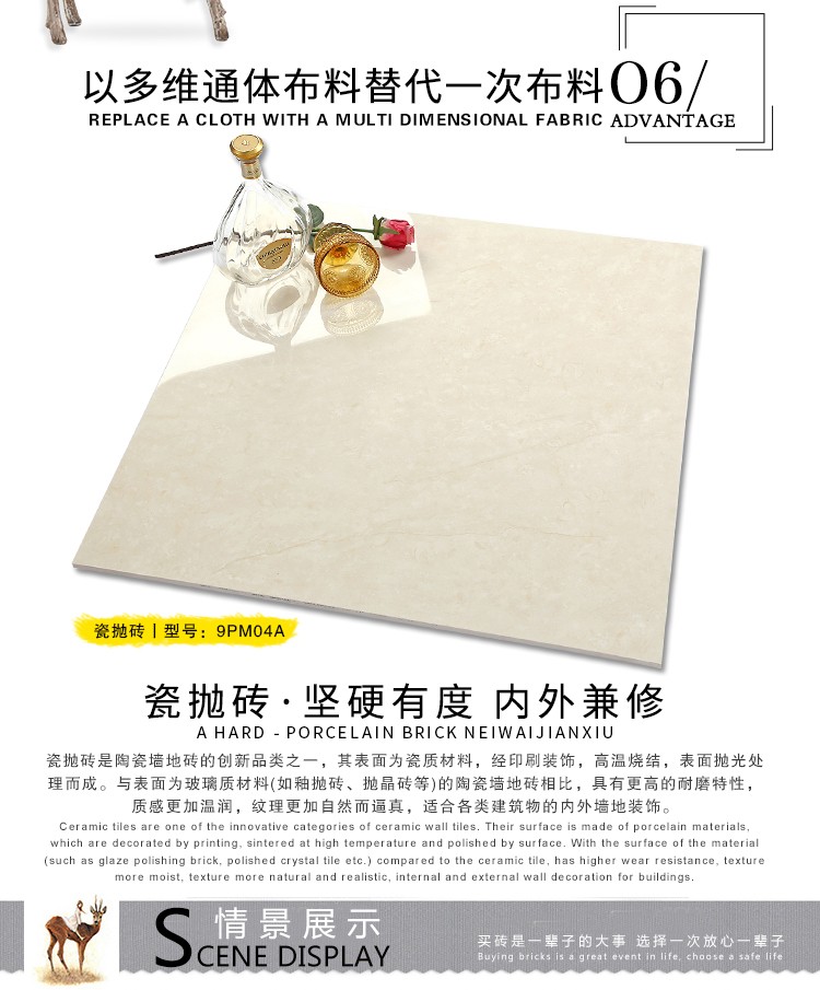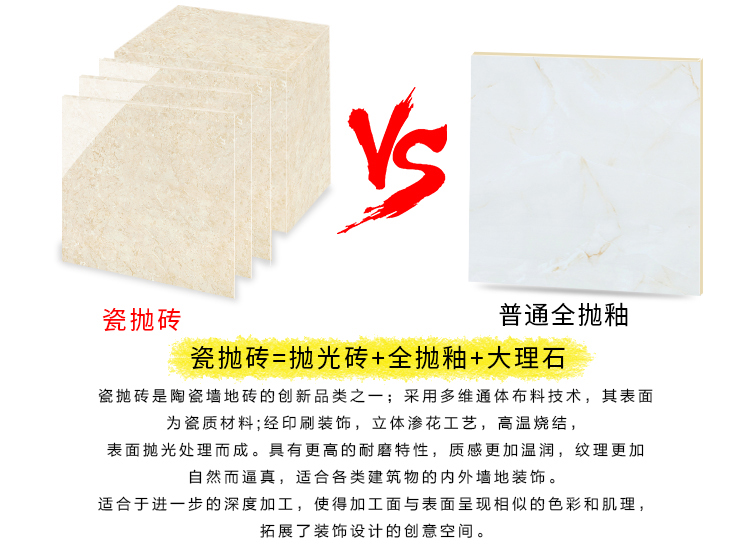 瓷拋磚,是陶瓷墻地磚的創(chuàng)新品類之一,其表面為瓷質(zhì)材料,經(jīng)印刷裝飾,高溫燒結(jié),表面拋光處理而成。與表面為玻璃質(zhì)材料的陶瓷墻地磚相比,具有更高的耐磨特性,質(zhì)感更加溫潤,紋理更加自然而逼真,適合各類建筑物的內(nèi)外墻地裝飾。
